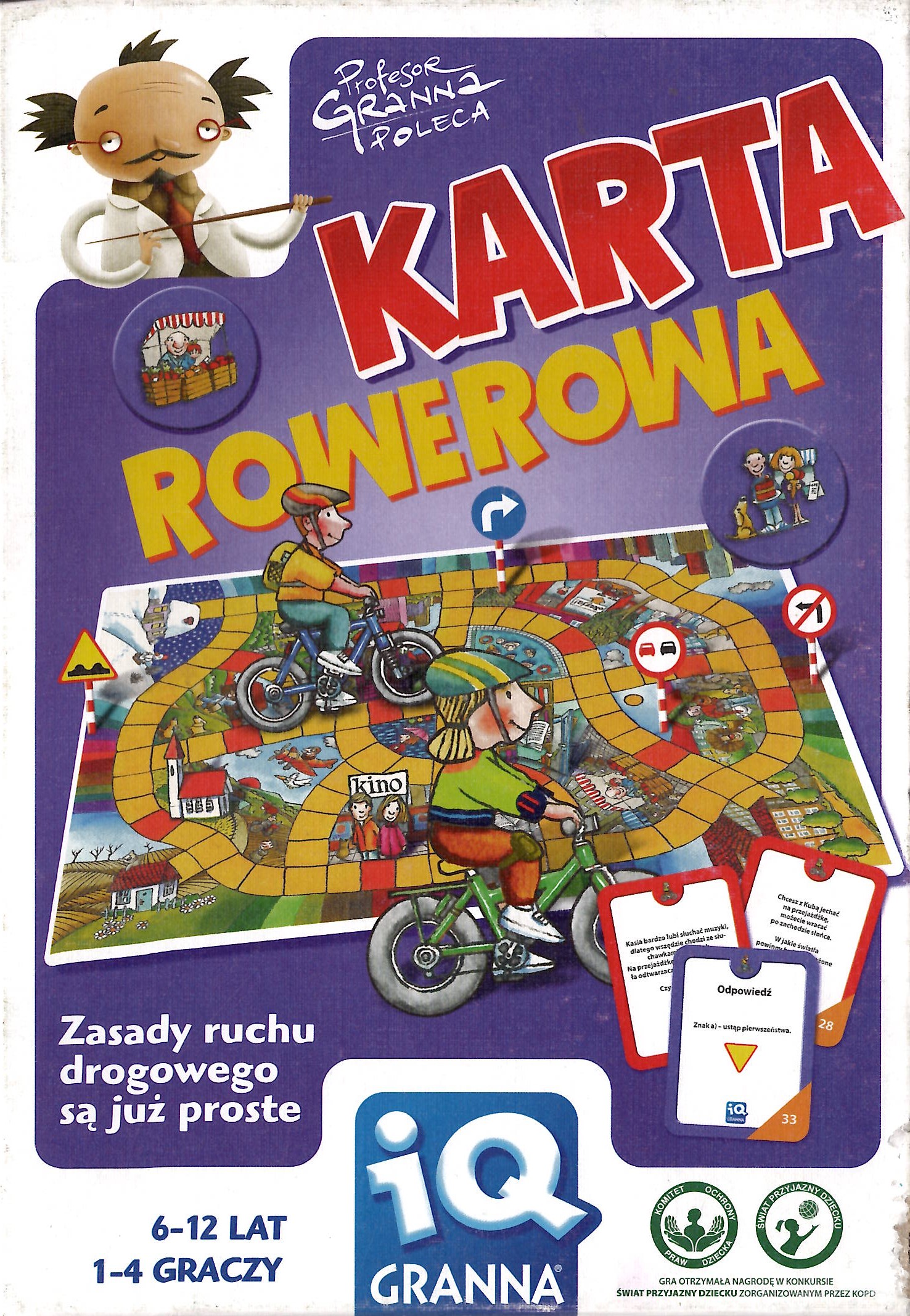 Karta rowerowa / Ewa Falkowska ; ilustracje: Marcin Bruchnalski. - Warszawa : Granna sp. z o.o., [2012]. - 1 gra (53 karty z pytaniami, plansza, 4 karty rowerowe, 12 żetonów z miejscami docelowymi, 4 rowerzystów z podstawkami, karta bezpieczeństwa, kostka do gry) : karton, kolor, tektura ; w pudełku 28x19x6 cm + instrukcja (4 strony : ilustracje ; 21 cm).