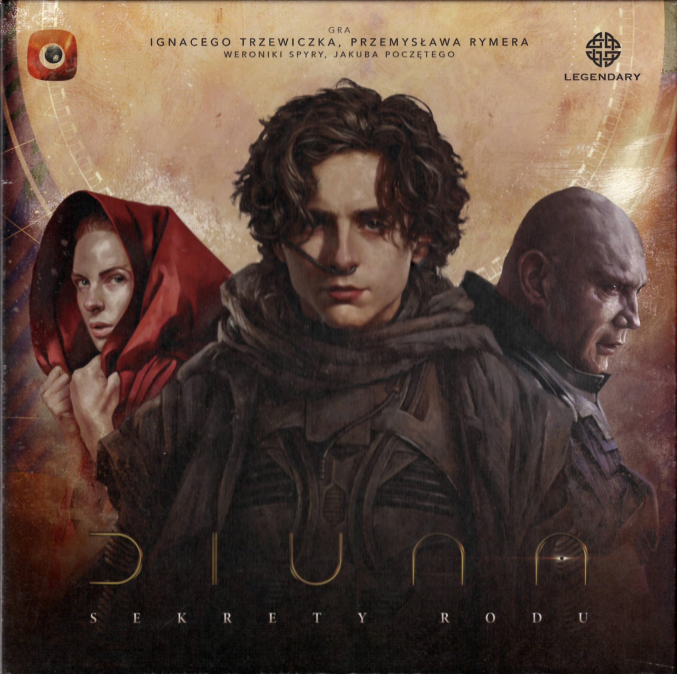 Diuna : sekrety rodu / projekt gry Ignacy Trzewiczek, Weronika Spyra, Jakub Poczęty ; scenariusz Przemysław Rymer ; ilustracje Mateusz Bielski, Maciej Janik, Tomasz Jędruszek, Hanna Kuik, Maciej Simiński. - Knurów : Portal Games Sp. z o.o., 2021. - 1 gra (1 talia spotkań, 1 talia ilustracji, 4 wprowadzenia rozdziałów, 1 znacznik konsekwencji, 1 znacznik czasu, 1 plansza gry, 5 żetonów konsekwencji, 27 żetonów zasobów, 1 arkusz naklejek umiejętności, 4 plansze postaci/sojuszników, 1 mapa Diuny, 1 Mapa Tel Gezer) : drewno, tektura, kolor ; w pudełku 8x30x30 cm + instrukcja (8 stron : ilustracje ; 28 cm).