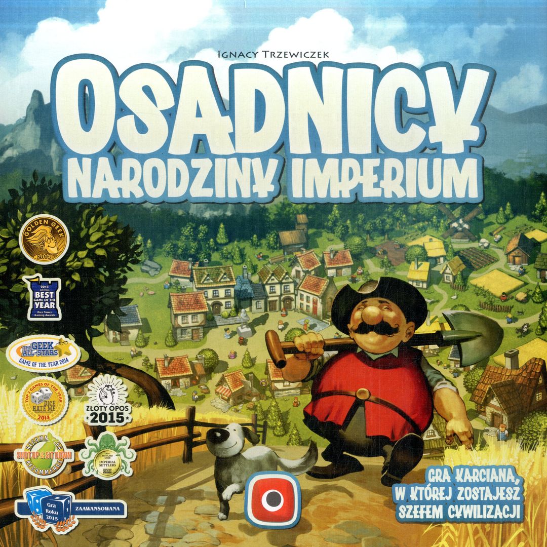 Osadnicy : Narodziny imperium / Ignacy Trzewiczek ; ilustracje Tomasz Jędruszek, Jarosław Marcinek, Mateusz Bielski, Rafał Szyma. - Gliwice : Portal Games Sp. z o.o., 2022. - 1 gra (220 kart, 136 drewnianych znaczników, 24 żetony złota, 18 żetonów plądrowania, 10 żetonów obrony, 6 żetonów mnożenia, 4 żetony Egiptu, 4 plansze frakcji, 4 znaczniki frakcji, 1 plansza punktacji, 1 znacznik rundy, 1 znacznik pierwszego gracza) : drewno, karton, plastik, kolor ; w pudełku 8x30x30 cm + instrukcja (14, [1] strona : ilustracje ; 28 cm).