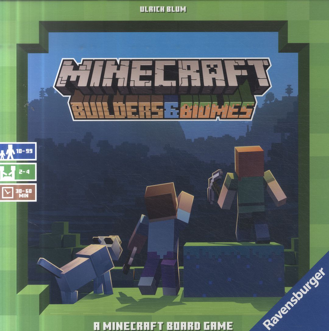 Minecraft : builders & biomes / Ulrich Blum. - Ravensburg : Ravensburger, 2019. - 1 gra (1 kilof, 1 łopata, 27 bloków drewnianych, 2 platformy, 1 plansza do gry, 25 kart zwierząt i mobów, 16 żetonów łopat, 1 pochodnia, 1 dom, dodatkowe wyzwania) : karton, tektura, drewno, kolor ; w pudełku 27x27x6 cm + instrukcja (40 stron : ilustracje ; 25 cm).